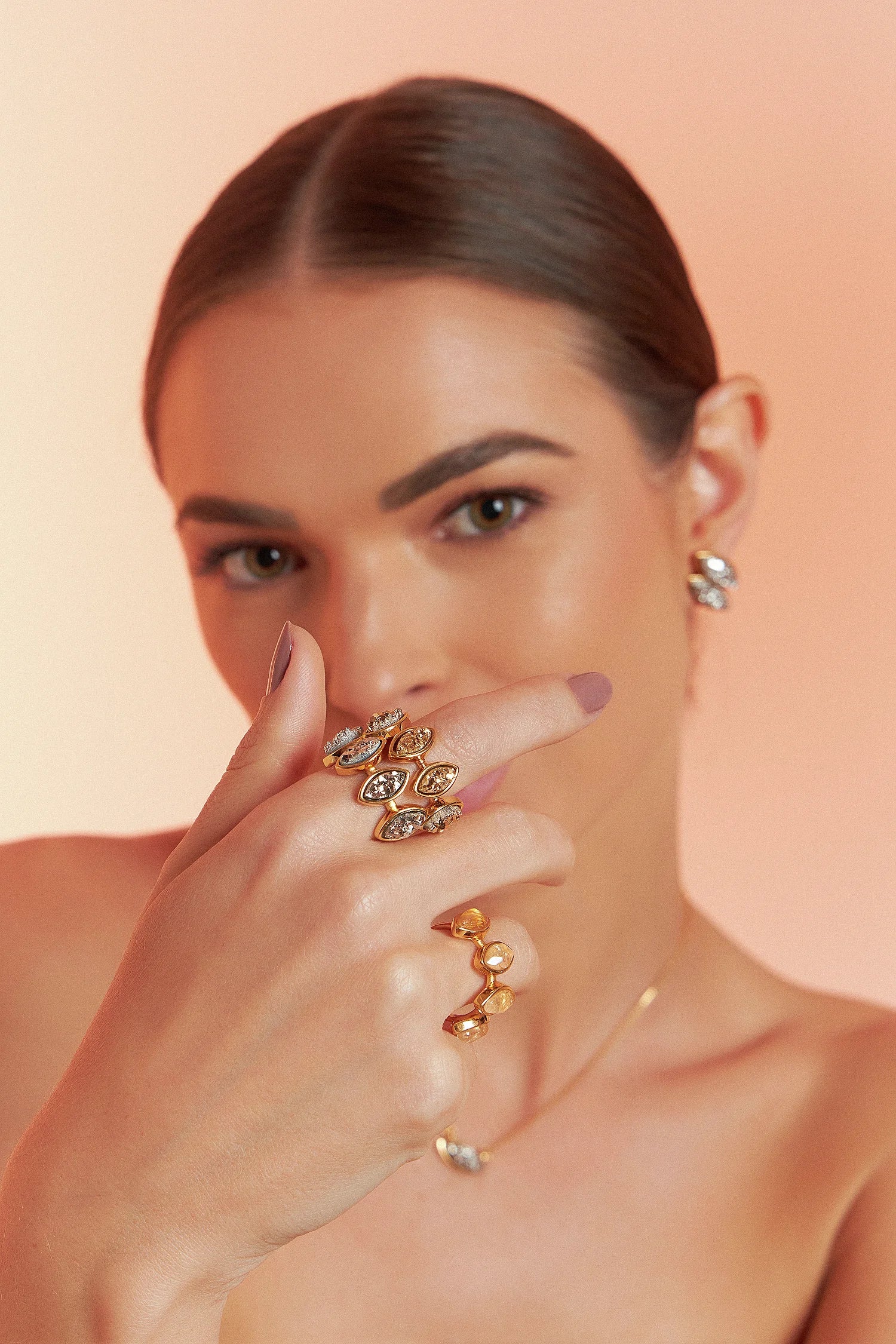 Uma homenagem à beleza natural da flor Dália, o anel apresenta uma composição delicada de pétalas, unindo sofisticação e romantismo a quem o usa. A Coleção Novos Clássicos recria designs atemporais com elegância.