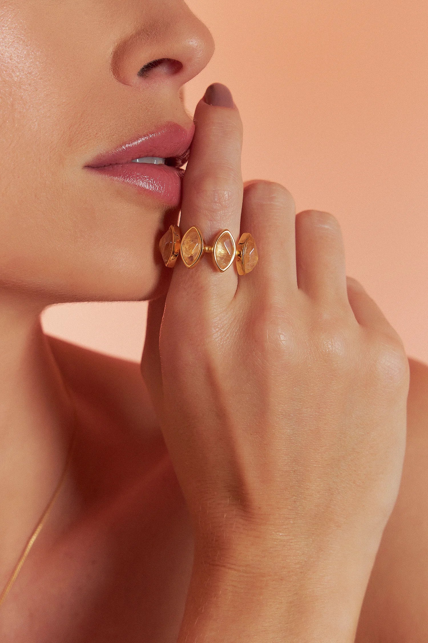 Use o Anel Dália com a pedra Citrino em Banho de Ouro 18K para atrair prosperidade, sucesso e aumentar sua energia.