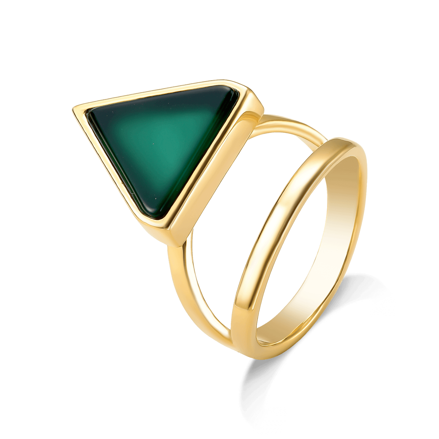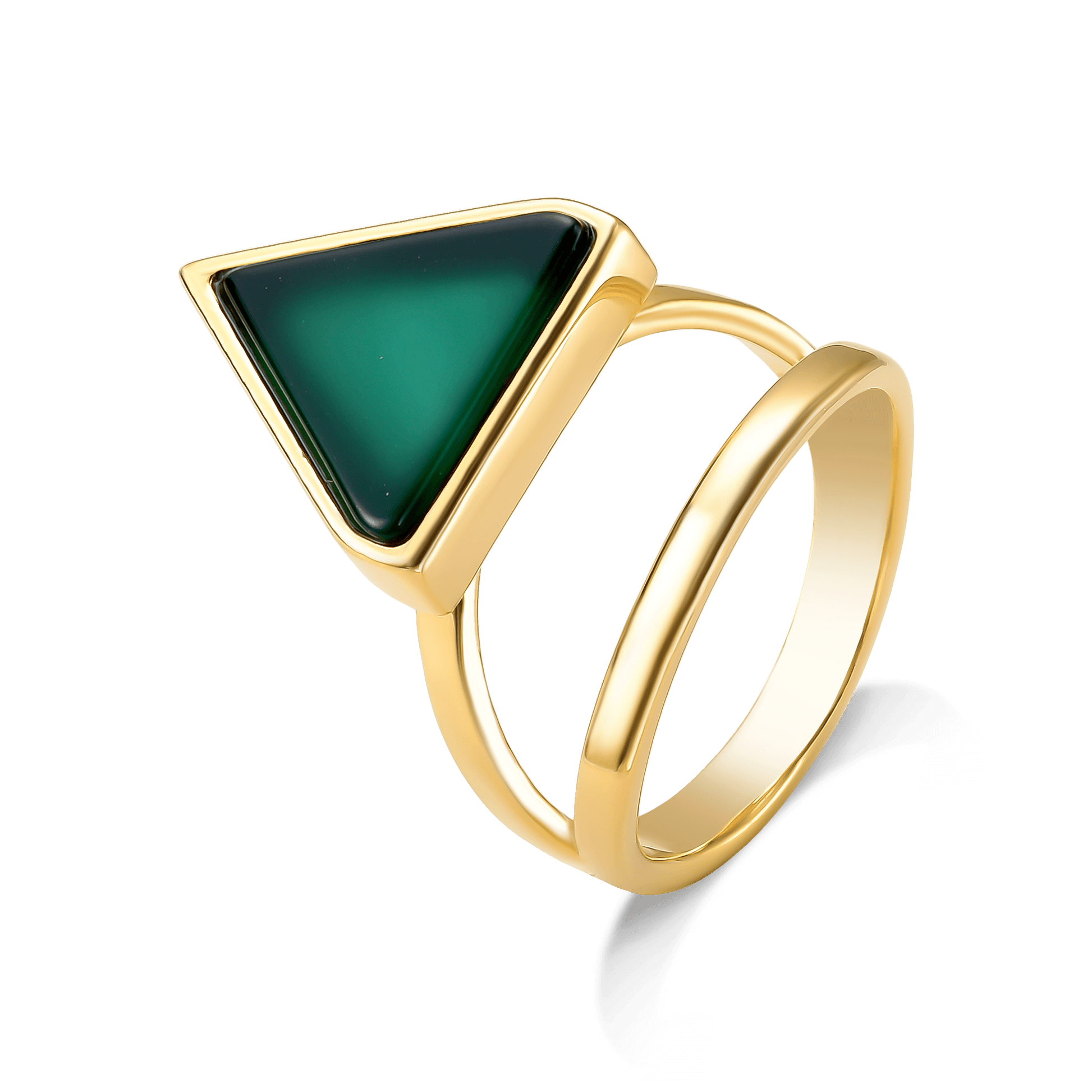 O Anel Dynamís com Ágata Verde tem um belo Banho de Ouro 18K. A Ágata Verde traz um toque de cor sofisticado, contrastando com o luxo do ouro. Seu formato triangular e a lapidação polida realçam o design minimalista e atemporal da peça.