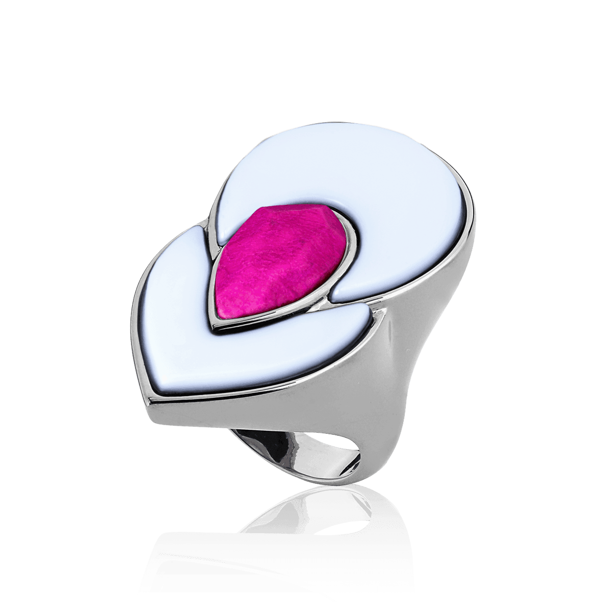 Esta joia combina a delicadeza do branco com a vibração do rosa, emoldurada pelo sofisticado Banho de Ródio Negro. O anel é adornado com a Porcelana, que adiciona um toque clássico e limpo, e o Feldspato Rosa Pink, que representa o amor e a suavidade feminina.
