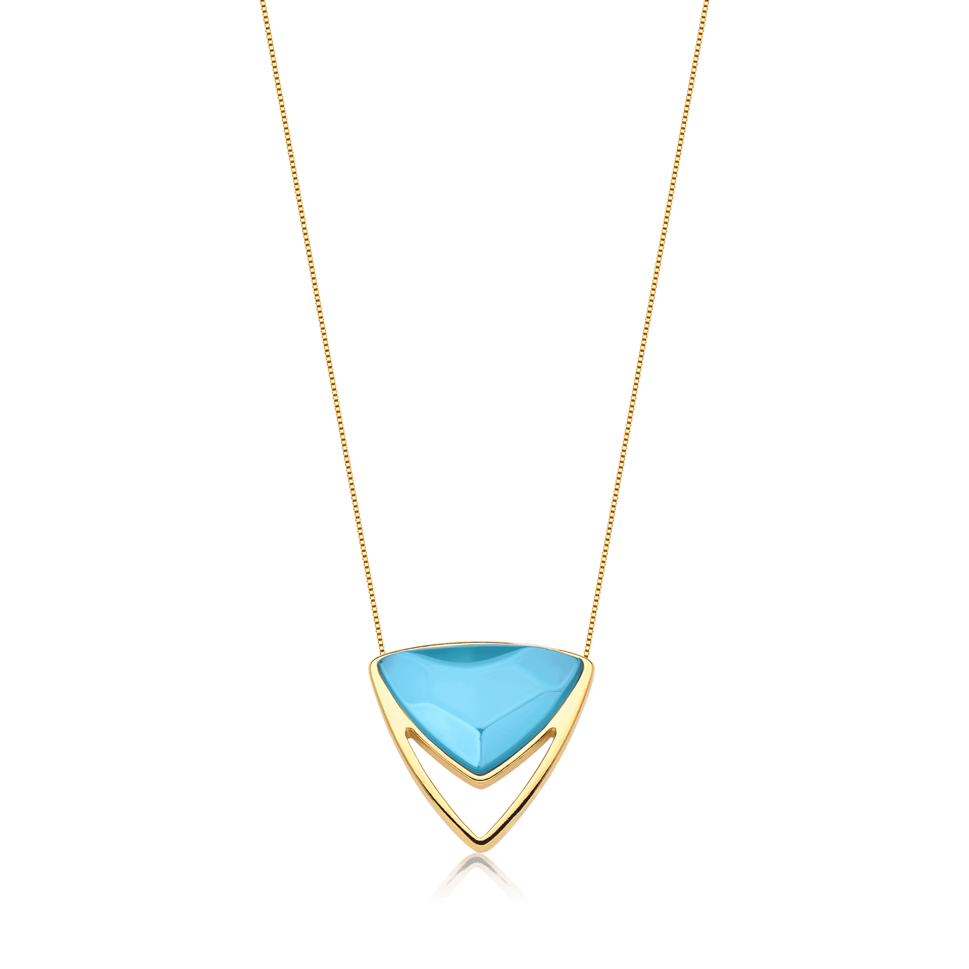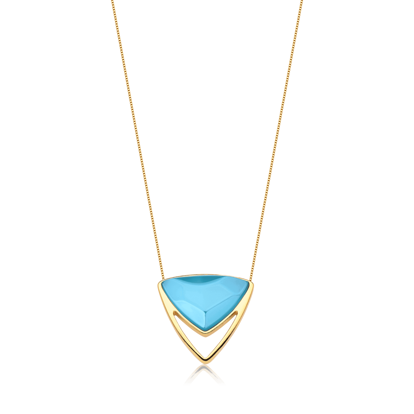 O Colar Equilíbrio harmoniza o Ouro com a Ágata Azul Céu, que remete à paz interior, sendo um acessório de semijoia de luxo de design atemporal.